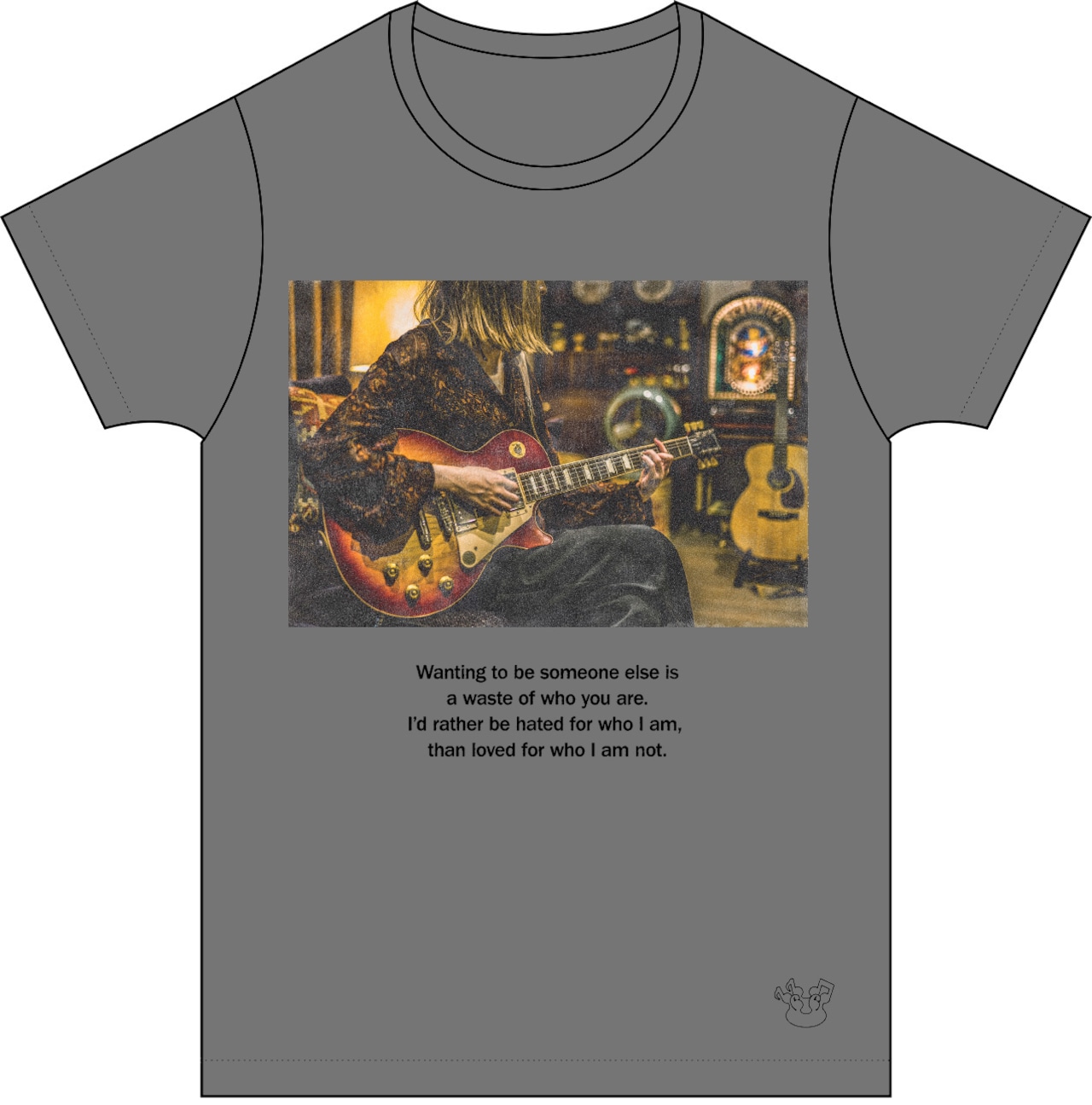 ヴィンテージな風合いのボディにプリントされたのは、ギターを弾く藤川本人の写真!